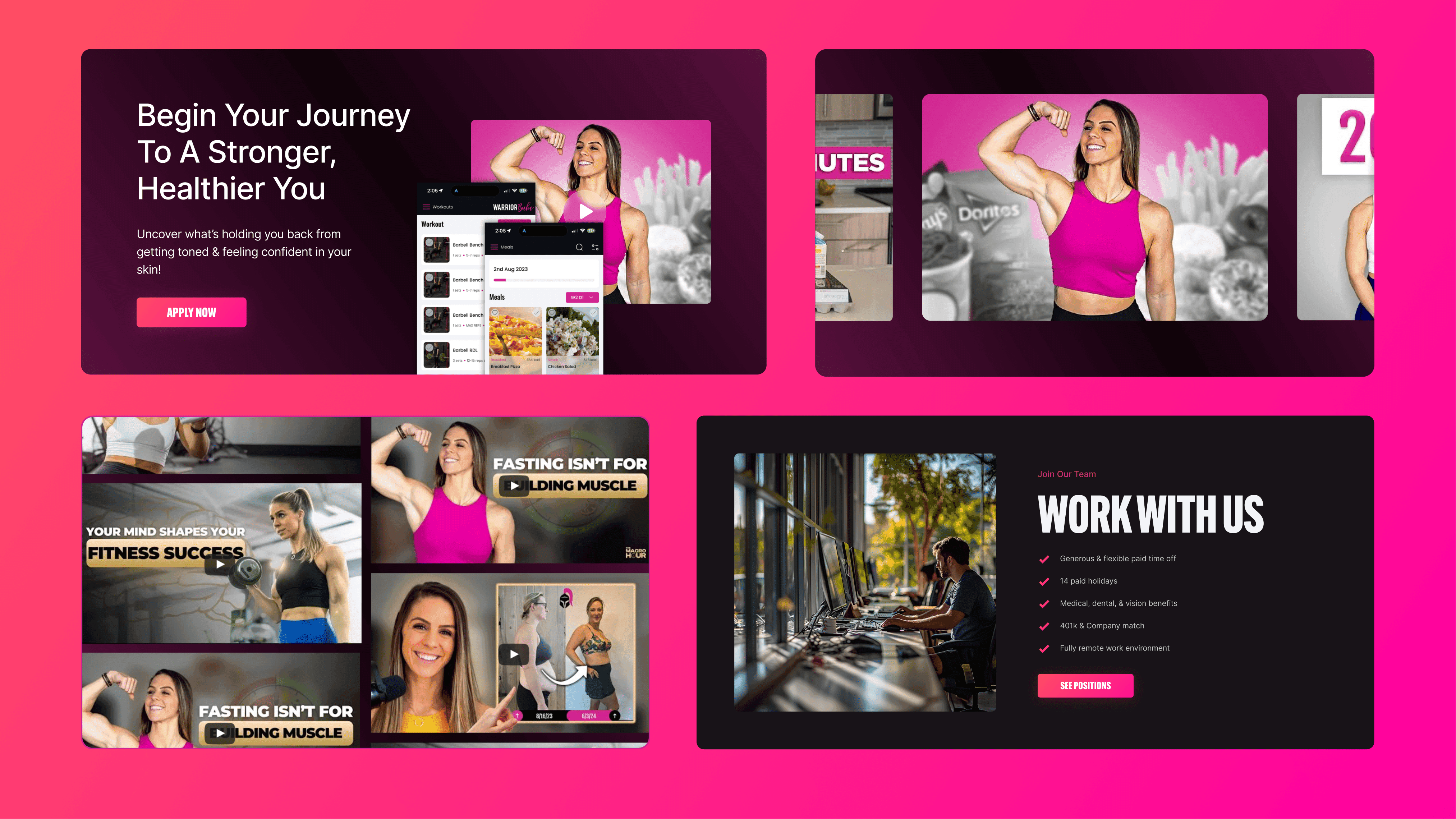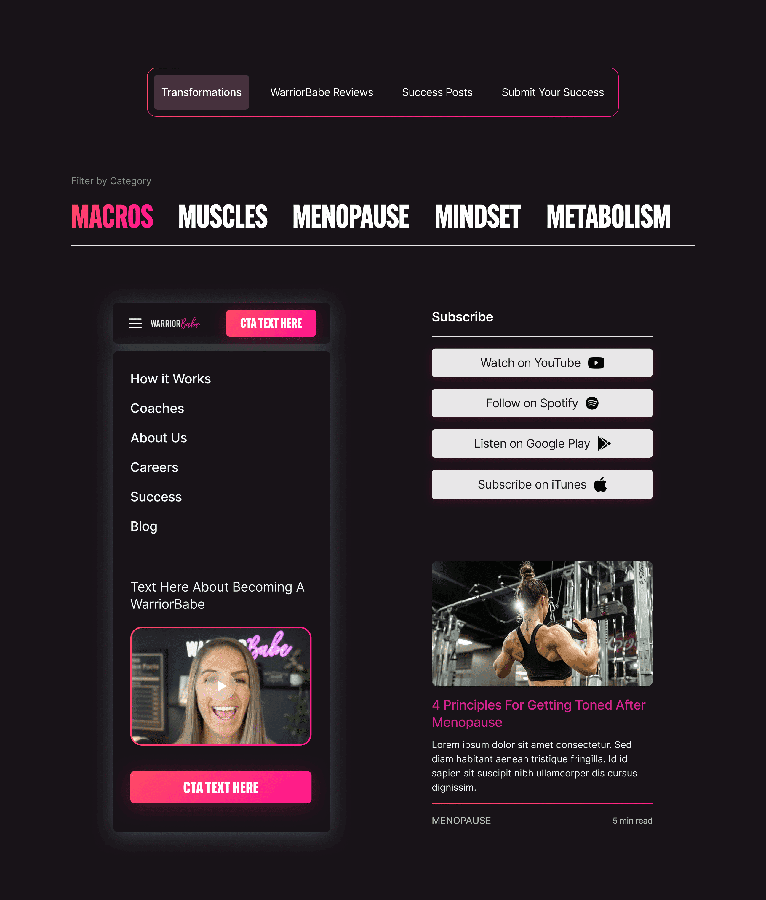 For a fast-growing fitness company with a well-tuned PPC conversion funnel, the only thing holding them back was a dated website that belied their sophisticated social strategy. A more aggressive typographic style mixed with a streamlined system of UI elements and design assets gave a clearer picture of how WarriorBabe could transform women's approach to fitness.